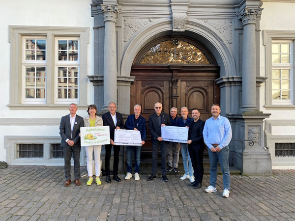 Die Vorstandsmitglieder von vier Lions Clubs (LC) bei der symbolischen Scheckübergabe vor dem alten Rathaus in Koblenz: Günter Hilger (LC Koblenz), Ina Rohlandt (Geschäftsführerin Koblenzer Hospizverein e.V.), Clemens Rouget (Vorstandsvorsitzender Koblenzer Hospizverein e.V.), Tom Schilling (LC Koblenz Rhein/Mosel), Jürgen Scholz (LC Vallendar) Peter Bäsch (LC Vallendar), Jürgen Kuhn (LC Koblenz Sophie von La Roche), Oberbürgermeister David Langner (LC Koblenz) und Dr. Stephan Lobitz (Chefarzt Kinderkrebsstation Kemperhof). Pressemitteilung